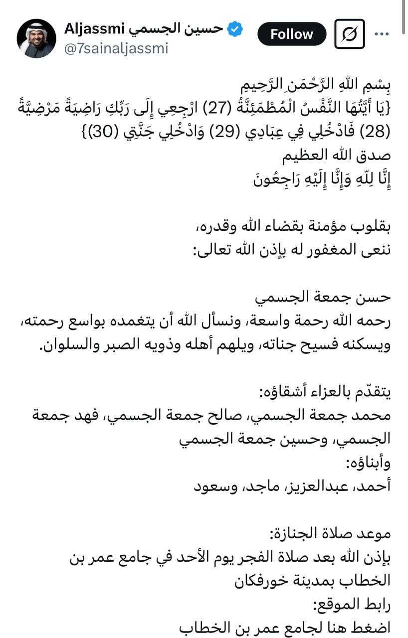 في هذا الاطار، كتب حسين الجسمي عبر حسابه على اكس:"بِسْمِ اللهِ الرَّحْمَنِ الرَّحِيمِ {يَا أَيَّتُهَا النَّفْسُ الْمُطْمَئِنَّةُ (27) ارْجِعِي إِلَى رَبِّكِ رَاضِيَةً مَرْضِيَّةً (28) فَادْخُلِي فِي عِبَادِي (29) وَادْخُلِي جَنَّتِي (30)} صدق الله العظيم، إِنَّا لِلّهِ وَإِنَّا إِلَيْهِ رَاجِعُونَ بقلوب مؤمنة بقضاء الله وقدره ننعى المغفور له بإذن الله تعالى: حسن جمعة الجسمي".