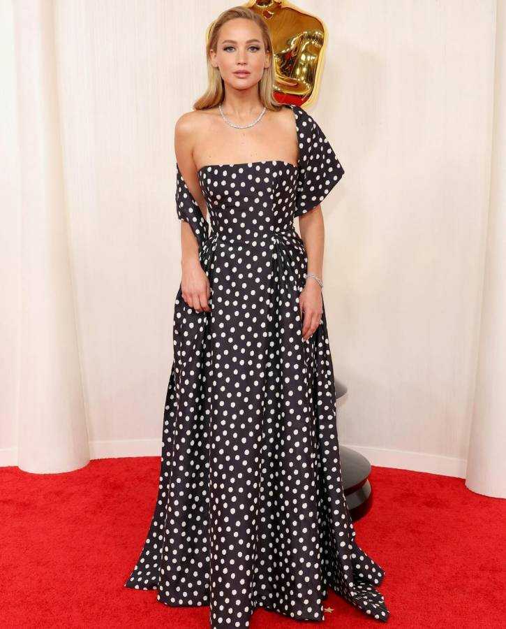 وتألقت النجمة جينيفير لورانس بفستان ناعم من Dior Couture بصيحة القماش المنقّط بدوائر كبيرة باللونين الأبيض والأسود، وجاء ضيقاً في الأعلى وواسعاً في الأسفل مع قصّة غريبة للكمّين زادت التصميم أناقةً، نسقته مع شال من قماش مواري مطبوع بنقاط بولكا كبيرة باللونين الأبيض والأسود.