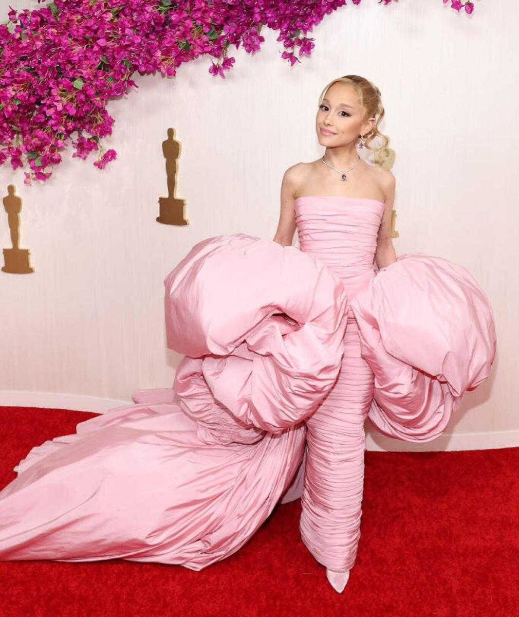 نبدأ مع المغنية أريانا غراندي التي ارتدت فستاناً وردياً مختلفاً في تصميمه من دار Giambattista Valli Haute Couture، حيث كان ضخماً من البليسيه ومصمماً من فقاعتين من القماش الوردي حول يديها، مع فستان محدد المقاس وطويل إلى الأرض.